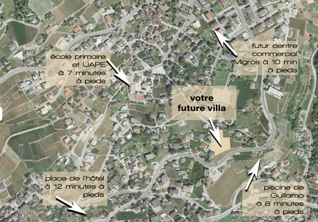 Son accessibilité par une voirie communale de quartier assure un faible niveau sonore et très peu de nuisances. Sa position en tête de la zone lui offre des dégagements généreux sur la vue vers le Val d’Anniviers pour les villas parallèles à la pente et sur la vallée du Rhône pour les villas perpendiculaires à la pente.